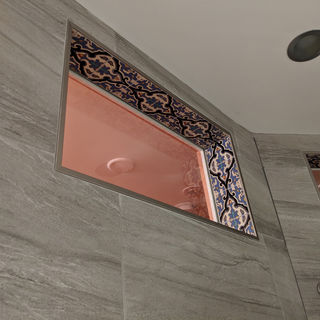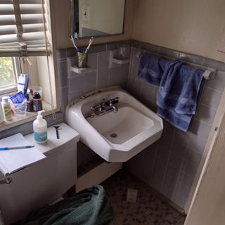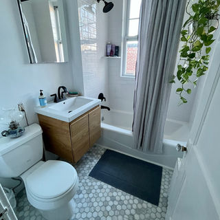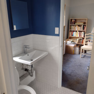 This Adams Morgan condo apartment bathroom renovation consisted of removing the existing toilet and sink then reinstalling them after the new work was completed. Removing the existing wall and floor tile, protecting the existing tub, replacing the existing plumbing pipes and shower faucet, installing new tile underlayment, building a niche at the side shower wall, installing new floor and wall tile, painting, new hardware, new light fixture, etc.